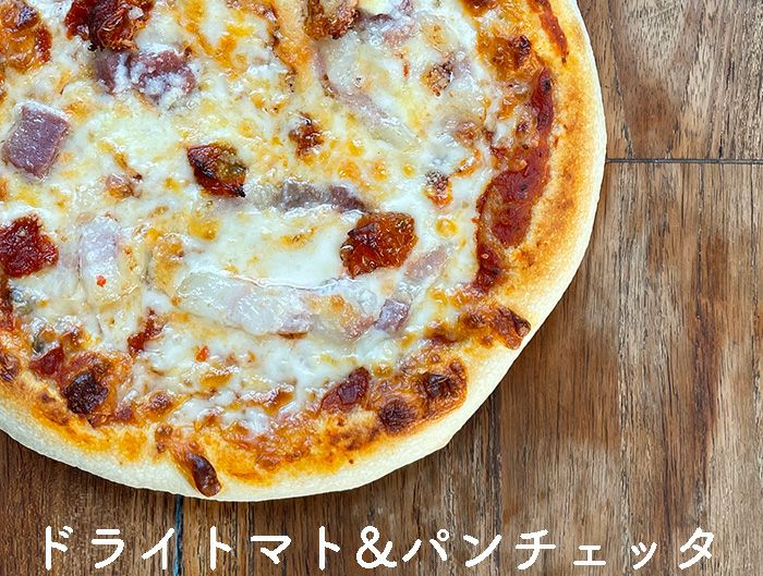パンチェッタ(豚バラの塩漬け)とハーブとガーリック漬けのドライトマトをトッピングしたプレミアムピッツァ!