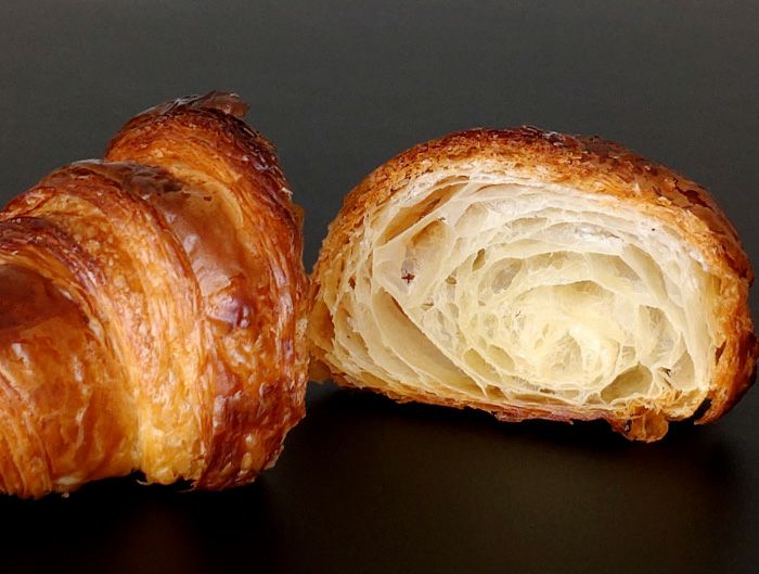 クロワッサンは、フランス発祥のパンで、外側はサクサク、内側はふんわりとした食感が特徴的です。発酵バターを練り込んで作られた生地を弊社独自の18層折り重ね、焼き上げることで、層が重なり合った独特の食感が生まれます。