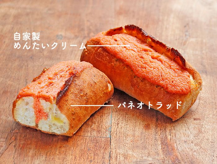 やみつきめんたいフランスは、マイルドな辛さの自家製めんたいクリームとガーリックバターを贅沢に使ったその名の通り「やみつき」な美味しさです。生地は、パネオトラッドを使用し、外はパリッと香ばしく、中はもっちりとした食感のフランスパンに、濃厚なめんたいクリームが絶妙に絡み、ひと口食べると止まらなくなる美味しさ。おつまみとしてはもちろん、軽食やランチにもぴったりです。トースターで温めると、バターの風味が引き立ち、さらに美味しくお召し上がりいただけます。