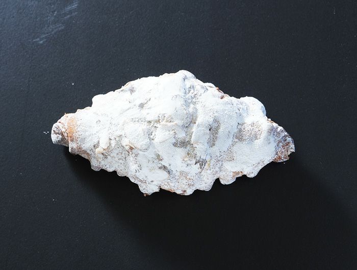 クロワッサンにカスタードクリームをサンドし、アーモンドクリームとアーモンドスライスをのせ焼き上げた。サイズは約長さ15?B、幅9?B、高さ5?B