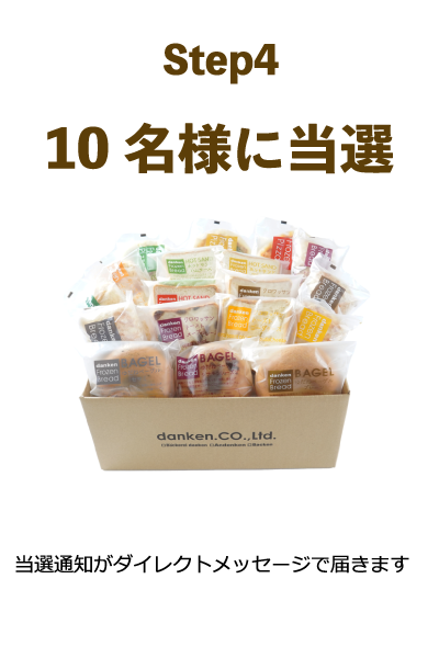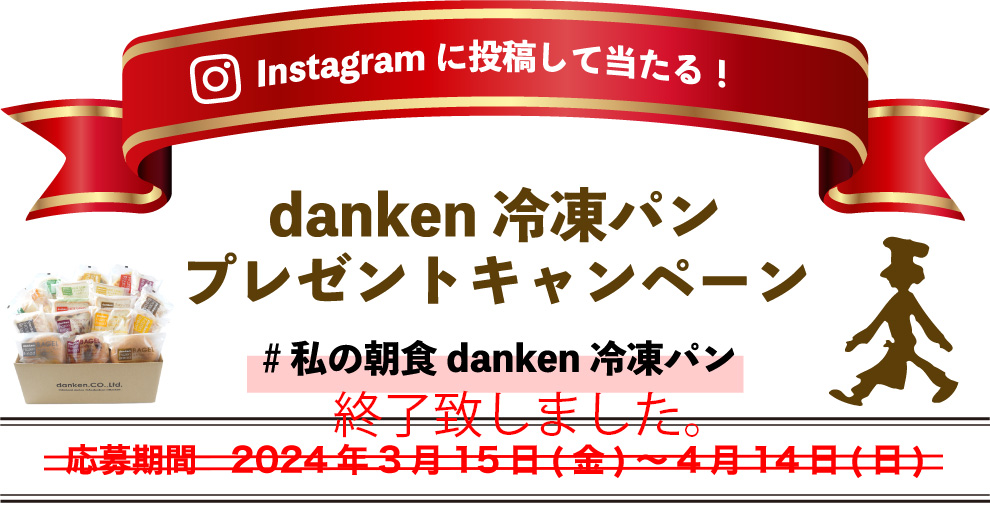 - 非公開アカウント、ハッシュタグがついていない投稿、danken冷凍パンが撮影されていない投稿、結果通知までの間にアカウントのフォローが解除された場合は、応募無効となりますのでご注意ください。